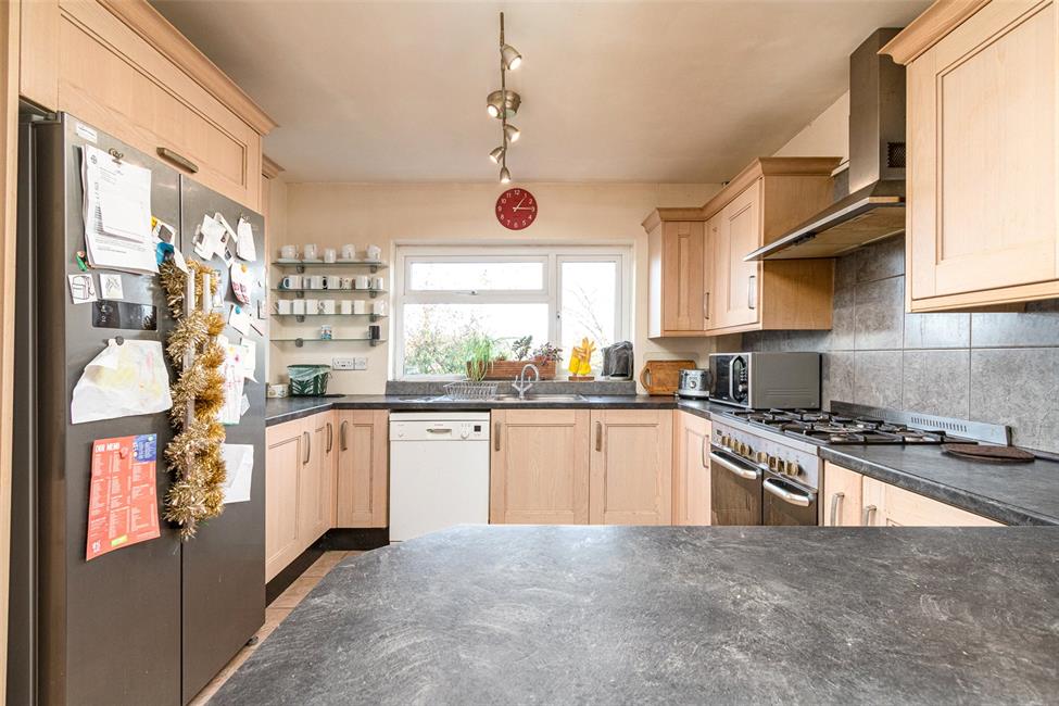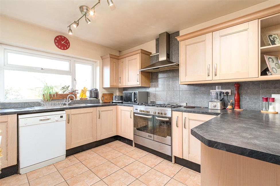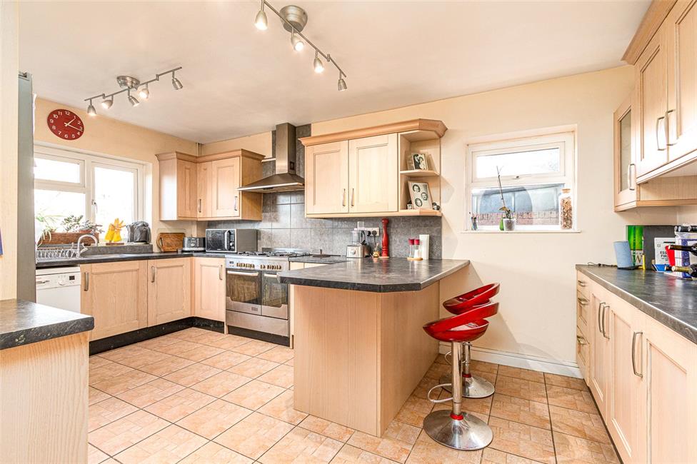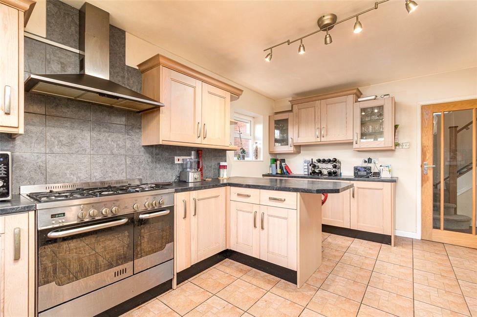 Window to both sides overlooking the rear garden, modern style oak kitchen, cupboard appointed along four sides comprising of soft closed eye level units and base units with drawers and round nosed worktops over, ceramic wall tiling to work surface surrounds, inset 1.5 bowl sink with mixer tap, plumbing and