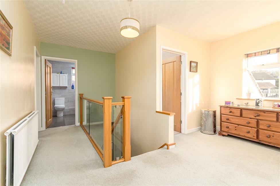 A large light and central landing overlooking the front driveway and quiet cul-de-sac with ample space for a work station and continuation of the 'Neville Johnson' glass balustrade, double radiator, doors to the first floor accommodation, loft access with pull down loft ladder, a large proportion of boarded floor, lighting.