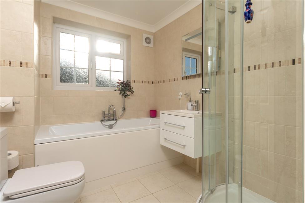 A beautifully appointed white bathroom suite comprising of a panelled bath with central mixer tap and flexible shower handle, sunken wash hand basin with storage beneath, a separate quadrant shower with thermostatic controls, close coupled push button WC, comprehensive ceramic wall tiling, ceiling spotlights, heated chrome towel rail, fitted vanity mirror, ceramic floor tiling.