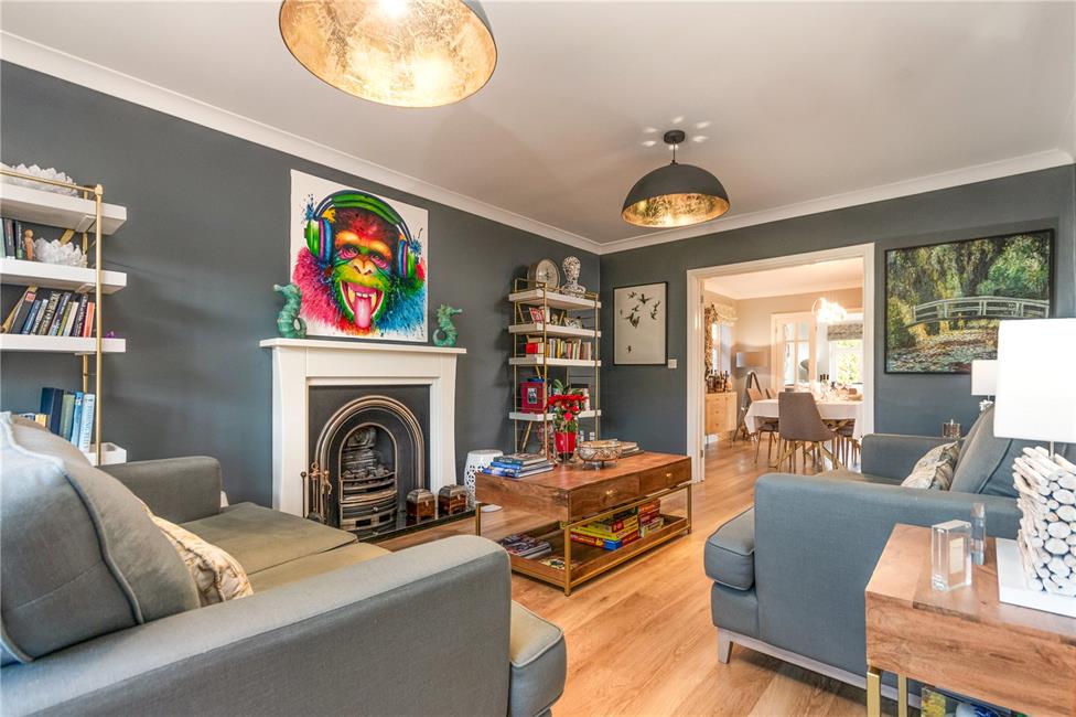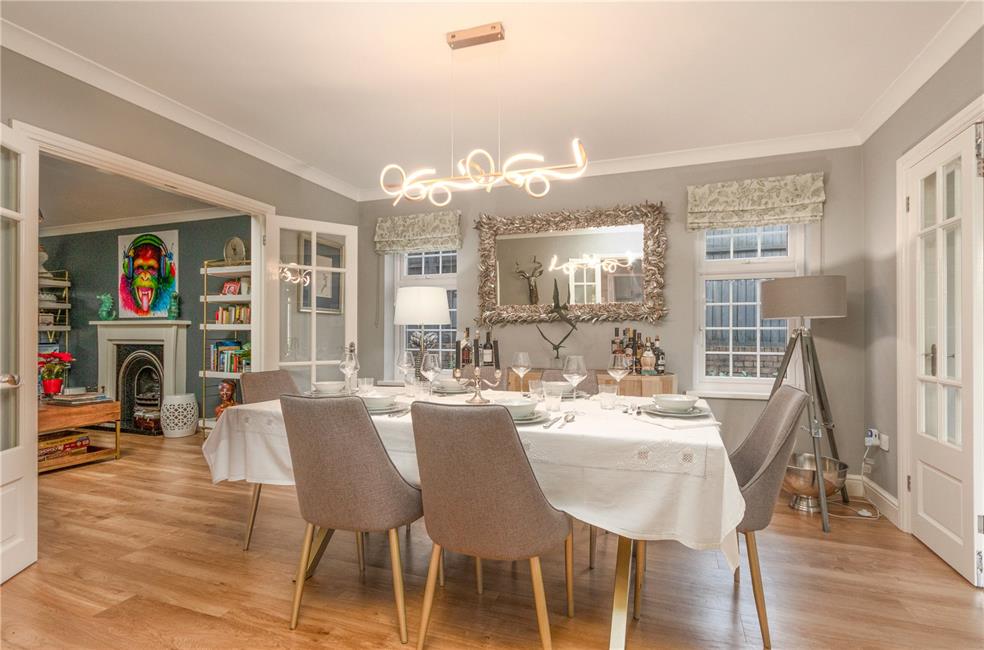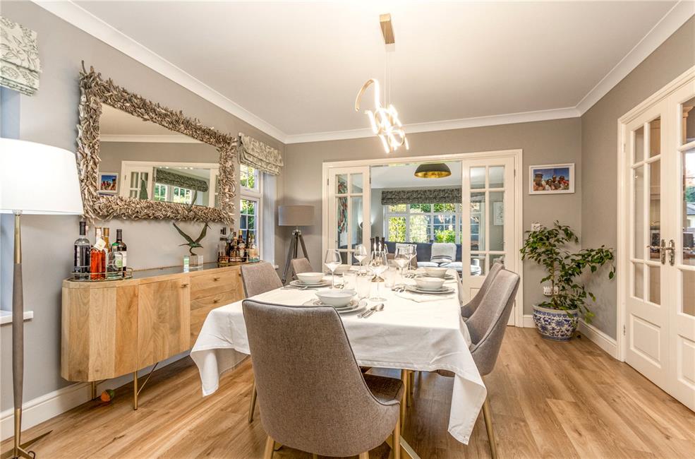 Two windows to the side, continuation of the quality oak style flooring, feature light fitting, radiator, traditional high level skirting boards, double doors into the kitchen with double bi-folding doors into the garden room.