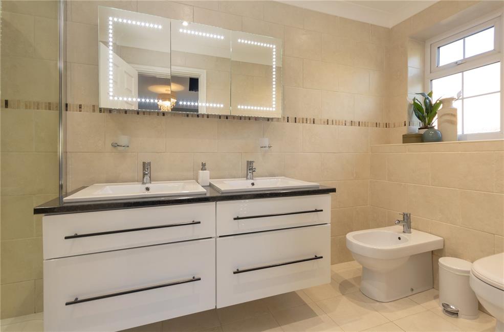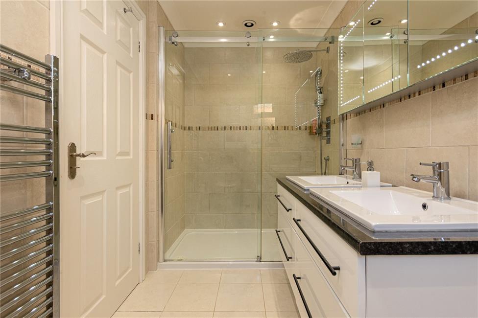 A beautifully appointed en suite, walk-in double shower with sliding glazed door, fixed rainfall style shower head and flexible handle with thermostatic controls, comprehensive ceramic wall tiling with decorative border to half height, sunken dual sinks with storage beneath, bidet, close coupled WC with concealed cistern and push button flush, heated chrome towel rail, ceiling spotlights, ceramic floor tiling, mirrored cabinet with touchless centred lighting and demisting function.
