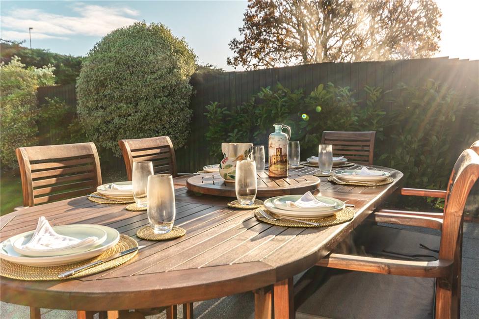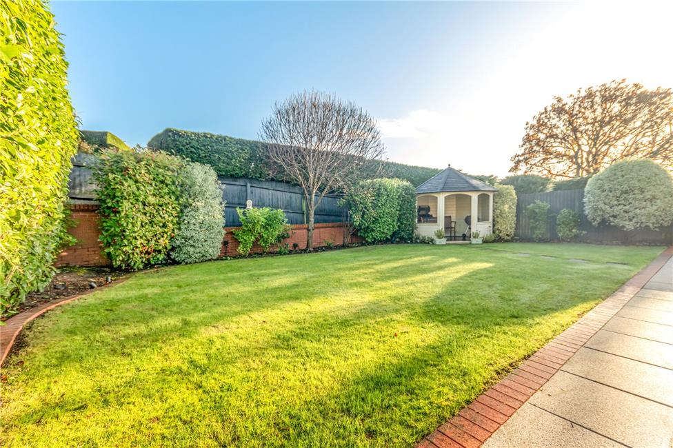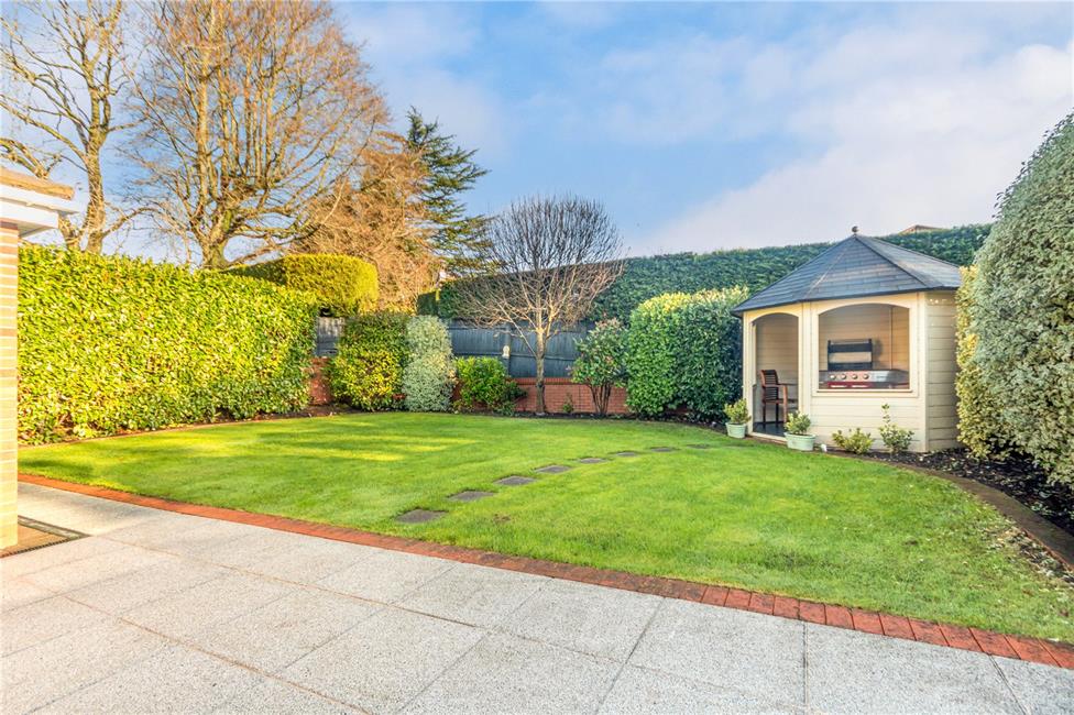 A beautifully presented low maintenance rear garden with high level laurel hedgerow to one side and fencing to the other, an initial large paved patio area leading onto a full width lawned garden with stepping stones to a covered seating area having external power points and lighting, outside water tap, courtesy lighting, wired in display lighting.