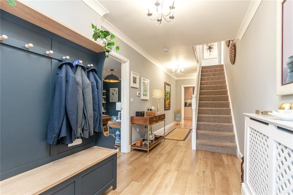 A generous entrance hallway approached by a composite steel double glazed panelled entrance door with matching side screens, Karndean quality wood effect vinyl flooring, traditional high level skirting boards, radiator, easy rising spindle staircase to first floor landing, under stairs storage cupboard.