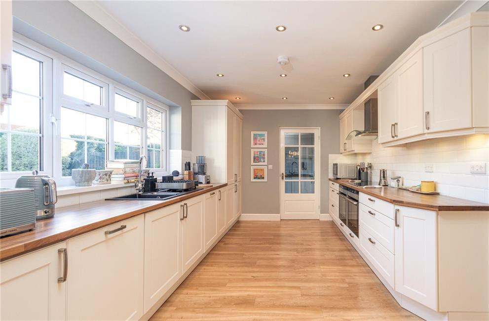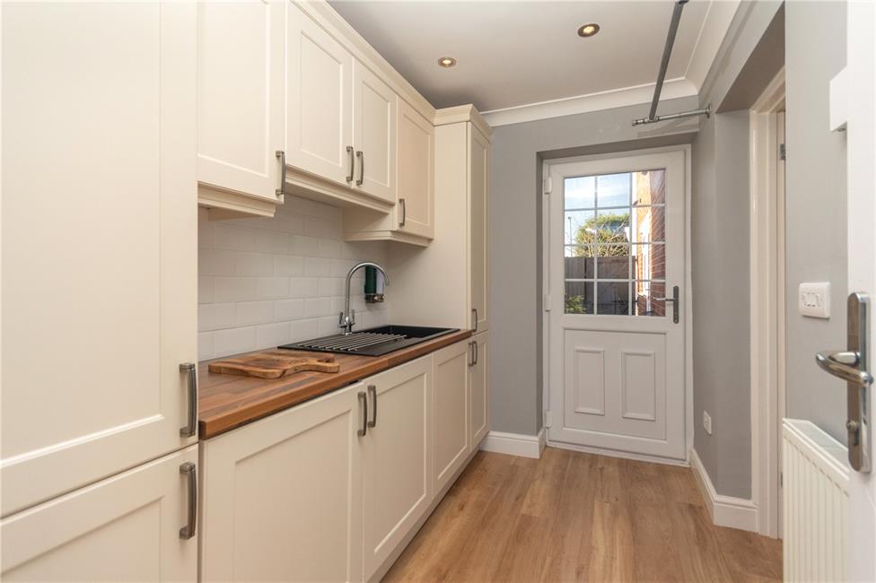 Overlooking the rear garden, a modern cream fronted kitchen appointed along two sides comprising of eye level units and base units with drawers, deep pan drawers and round nosed wood effect worktops over, 1.5 bowl sink with swan neck mixer tap, ceramic subway style wall tiling to work surface surrounds, quality Siemens five burner induction hob with glazed cooker hood above and two full size ovens beneath, integrated dishwasher, integrated bin storage, full height integral fridge and freezer, continuation of the quality oak style flooring, ceiling spotlights, panel glazed door into the utility room.