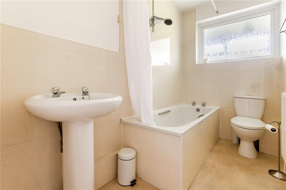 White suite comprising low level WC with push button cistern, pedestal wash hand basin, twin grip panelled bath with electric Triton shower, obscure glazed window to side, ceramic wall tiling to wet areas, vinyl flooring.