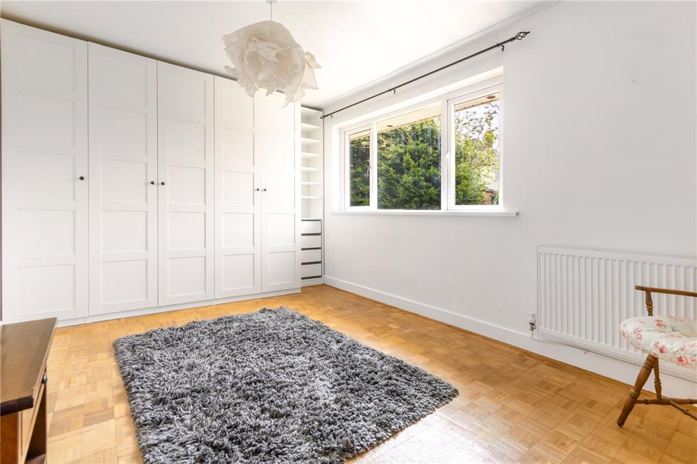 Overlooking the lawned rear gardens, range of quality fitted wardrobes with storage drawers, hanging rails and shelving, original parquet flooring, radiator.