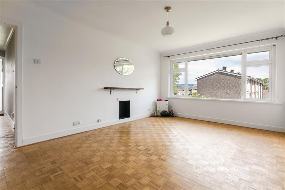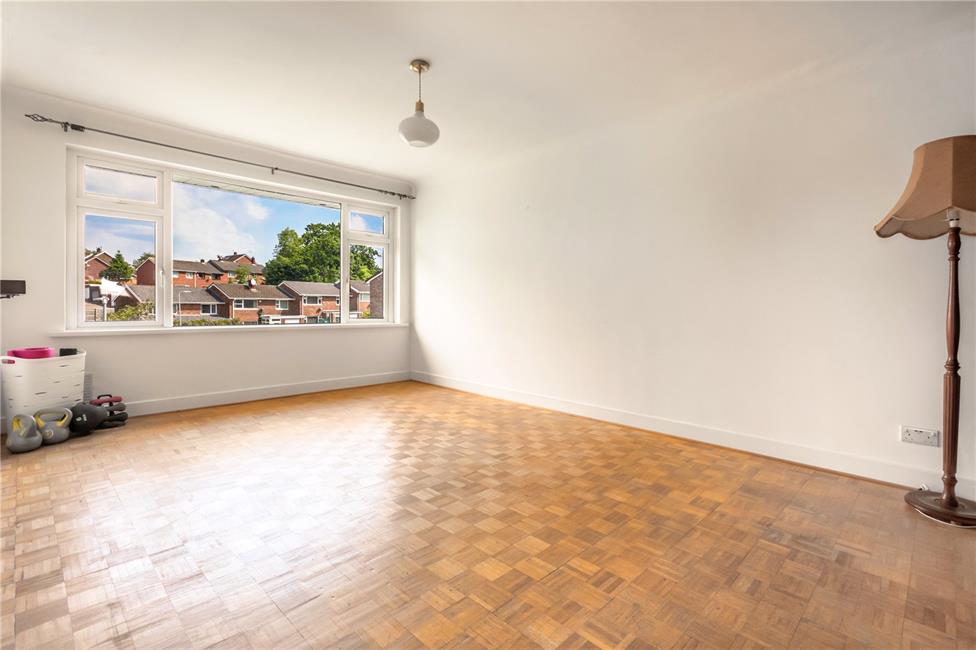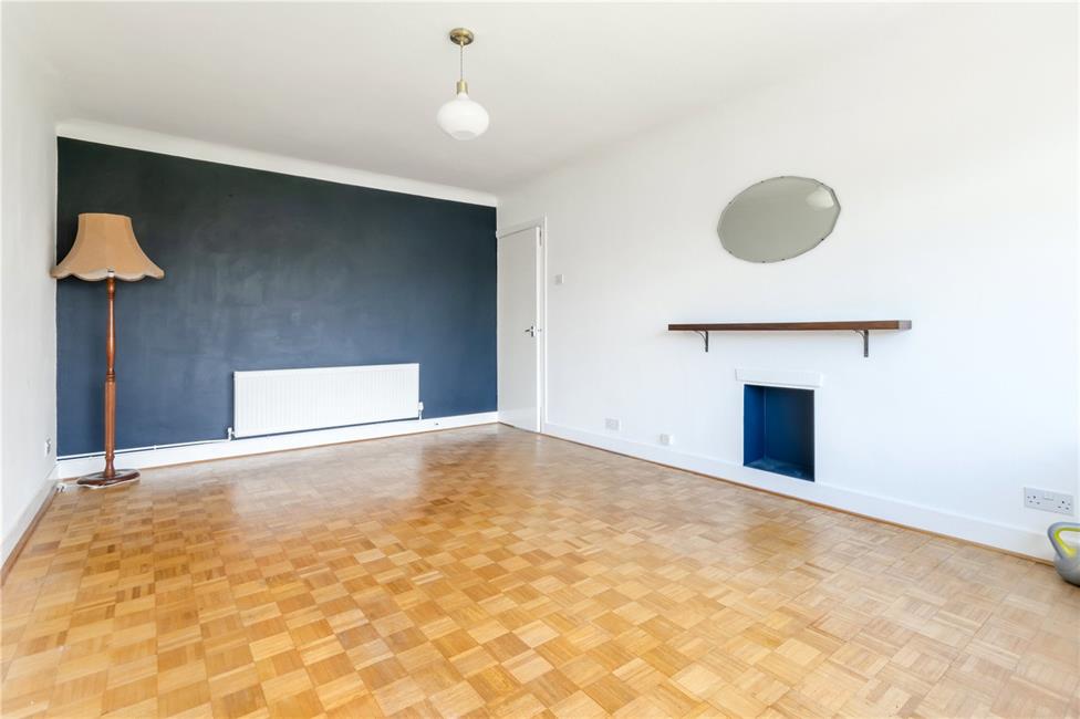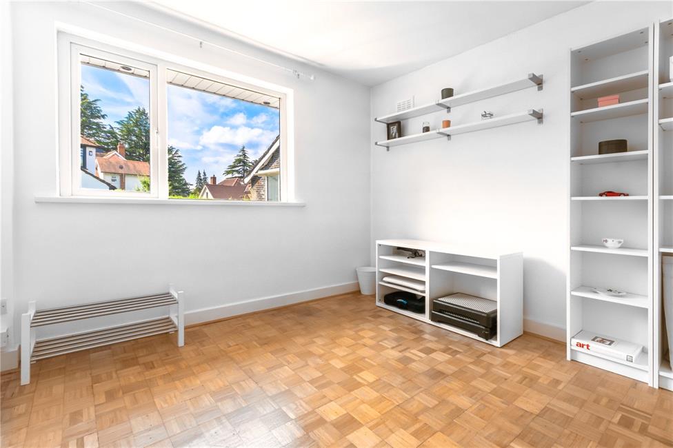 Large window overlooking the front lawned gardens, continuation of the original parquet flooring, coved ceiling, radiator.