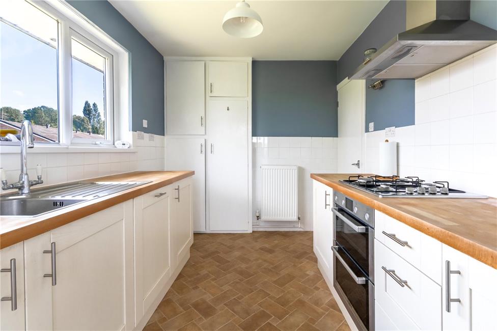 Appointed along two sides in light wood grain finish fronts beneath wooden worktop surfaces, inset stainless steel sink and drainer with swan neck mixer tap, four ring Bosch gas hob with oven below and stainless steel cooker hood, ceramic wall tiling to worktop surrounds, integrated Bosch dishwasher, built-in storage cupboard housing the wall mounted gas combination boiler, window to front, radiator, vinyl floor covering.