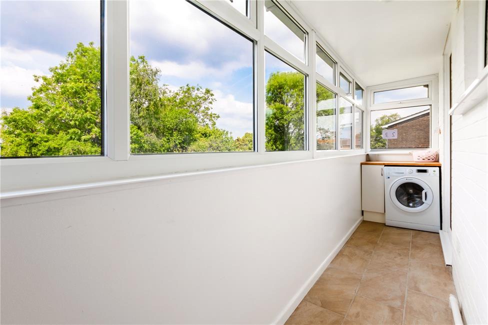 Approached by external stairs and uPVC entrance door with glazed insert to upper part, windows to two sides, quality tiled flooring, space for automatic washing machine with storage cupboard and worktop over, glazed uPVC doors to kitchen and secondary door leading into the central hallway.
