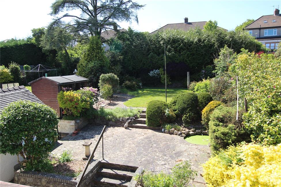 82ft deep with an initial paved patio, curved retaining wall and steps leading up to a mid-patio and further steps leading to a generous lawned area with crazy paved path leading to the rear boundary, high level tree lined offering privacy, timber garden shed with power and lighting, various areas of flower beds, plants and shrubbery, water feature including water tap, external lighting, access door to garage.