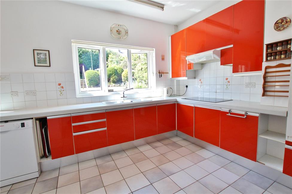 Extended from its original design with ceramic floor tiling, overlooking the rear patio and garden beyond, red gloss kitchen units appointed along three sides comprising of eye units and base units with drawers and round nosed worktops over, inset 2.5 bowl sink with mixer tap, ceramic wall tiling to work surface surrounds, four burner touch button induction hob (fitted 2022), eye level double oven, space for upright fridge/freezer, plumbing and space for dishwasher, further plumbing and space for washing machine and separate drier, wall mounted Glow-worm gas central heating boiler installed 2024, radiator, built-in display shelving, further full height larder cupboard, small loft access, uPVC double glazed door giving access to the rear garden.