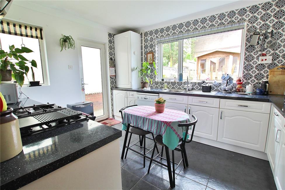 Overlooking the rear garden, white kitchen appointed along three sides comprising of eye level units and base units with drawers and black granite style worktops over, ceramic wall tiling to work surface surrounds, inset 1.5 bowl sink with mixer tap, Rangemaster cooker with five burner gas hob and multiple ovens below, extractor cooker hood above, further window to side, uPVC double glazed door giving access to the side which leads to a covered walkway to the laundry room and rear garden. Worcester gas central heating boiler concealed behind a matching wall unit, plumbing and space for dishwasher, integrated fridge.