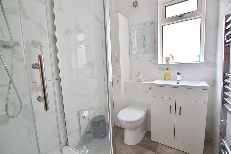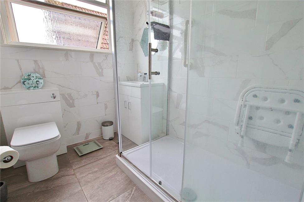 Recently modernised in 2020, opaque window to side, modern suite comprising of a large shower cubicle with sliding glazed door, fixed rainfall style shower head with flexible handle and thermostatic controls, comprehensive stylish marble effect wall tiling, sunken wash hand basin with storage beneath, close coupled push button WC, storage cupboard, chrome towel rail, ceramic floor tiling, ceiling spotlights.