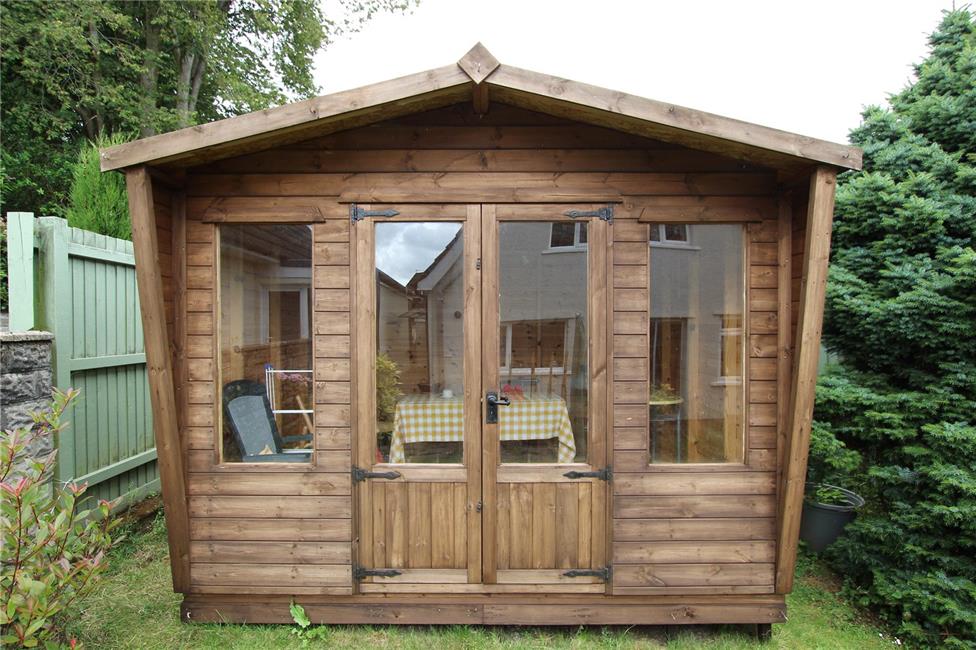 Enclosed with a patio area, a split level garden with a small stone retaining dividing wall, outside lighting, large timber summerhouse and a small area to the side.