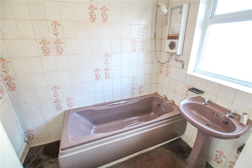 Comprising low level WC, pedestal wash hand basin, panelled bath Dolphin shower, radiator, built out airing cupboard housing hot water cylinder with shelving.