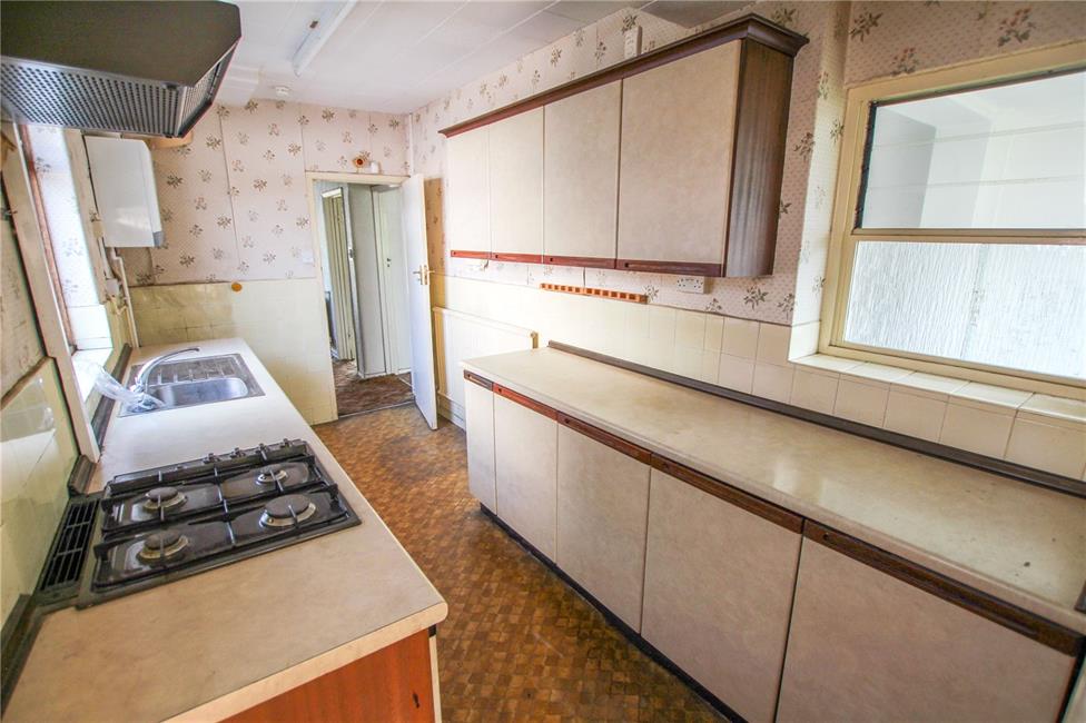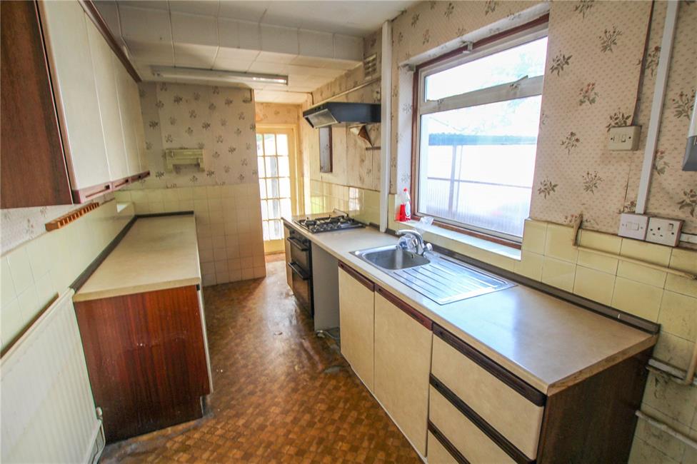 With a range of base and eye level cupboards beneath round nose worktop surfaces, inset four ring gas hob with grill and oven below, extractor fan above, window to side, inset stainless steel sink with drainer with mixer tap, panelled radiator, wall mounted Baxi gas central heating boiler, fully glazed door leading to the rear garden.