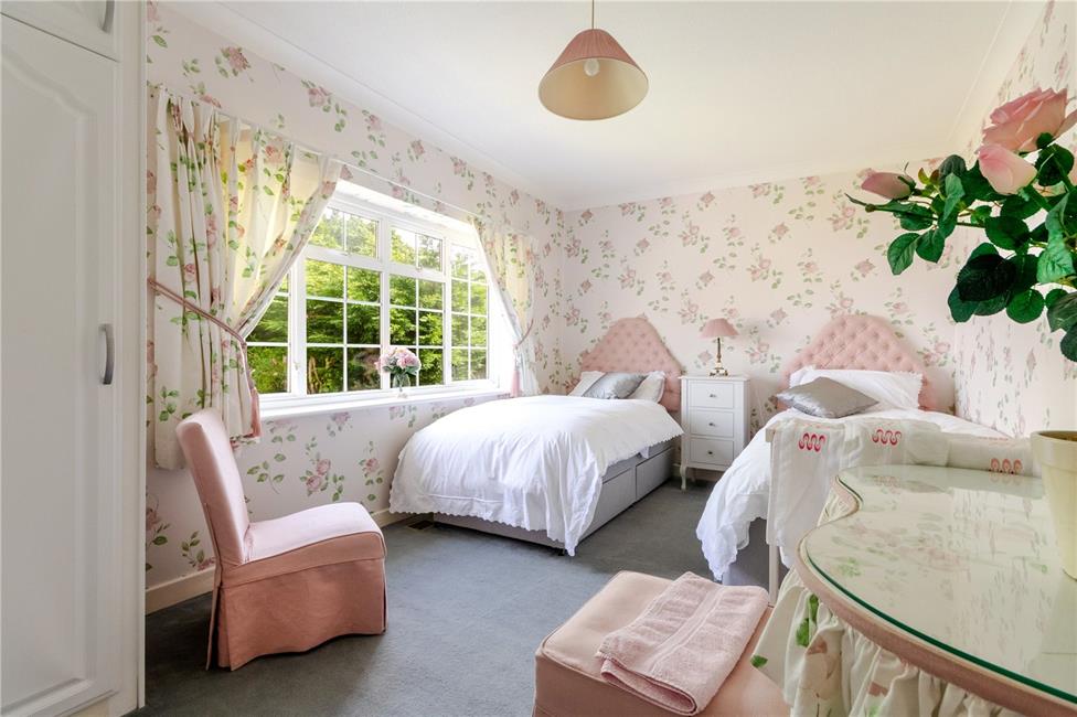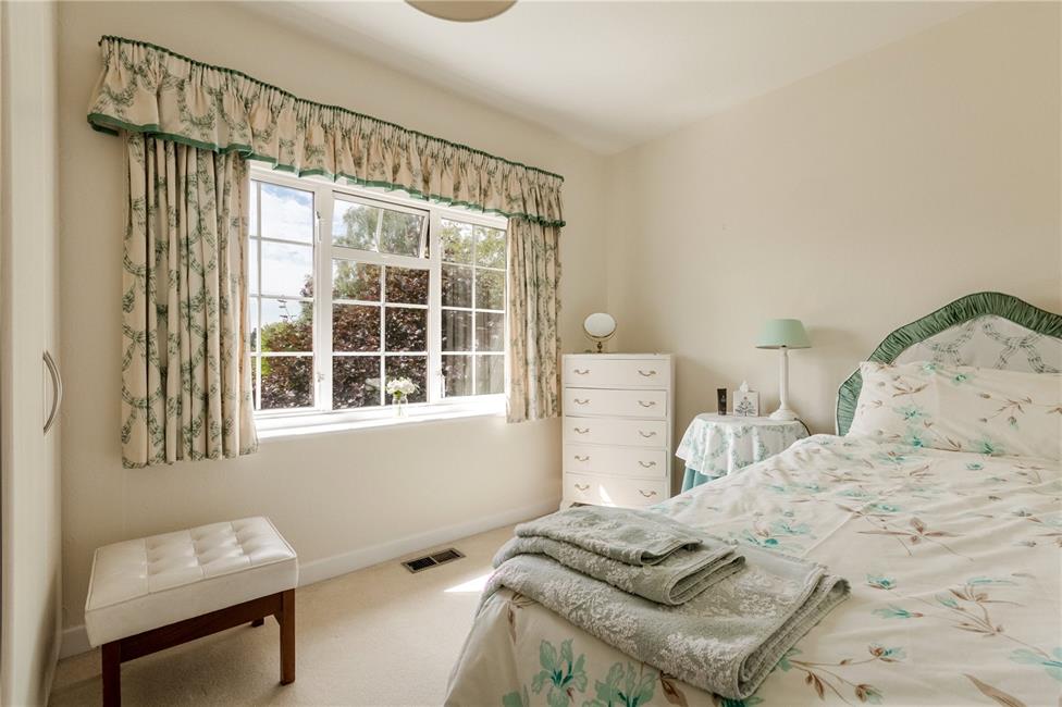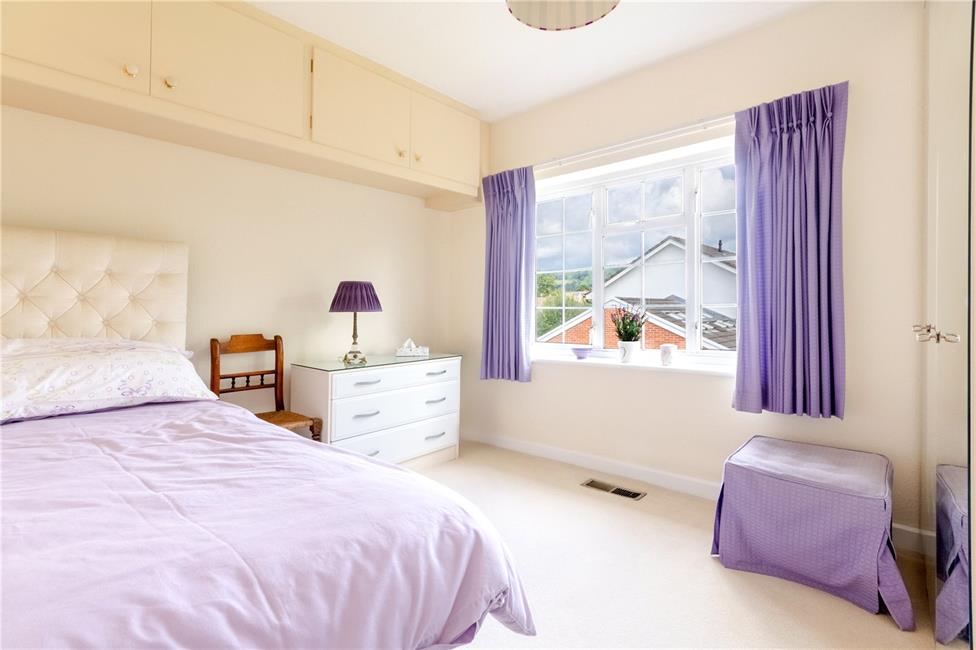 Overlooking the attractive landscaped rear garden, a second double bedroom, quality built-in wardrobes with hanging rails and shelving, coved ceiling.