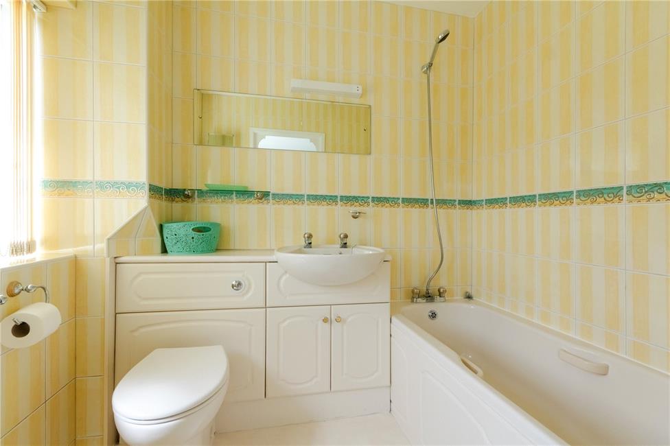 Low level WC with concealed cistern, sunken wash hand basin with cabinets below, twin grip panelled bath with shower mixer tap, comprehensively tiled walls, obscure glazed window to front, vinyl flooring.