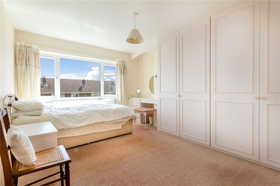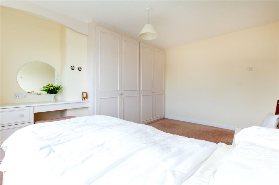 Large window to front, a generous double bedroom, range of fitted wardrobes to one side with hanging rails and shelving, matching fitted dresser unit, radiator.