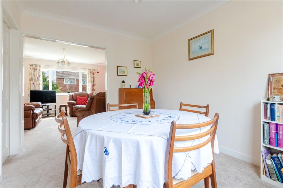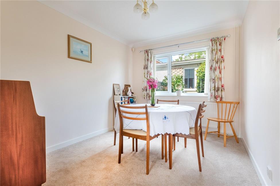 Overlooking the rear garden, amble space for a family dining table, coved ceiling, radiator, and connecting door to kitchen.