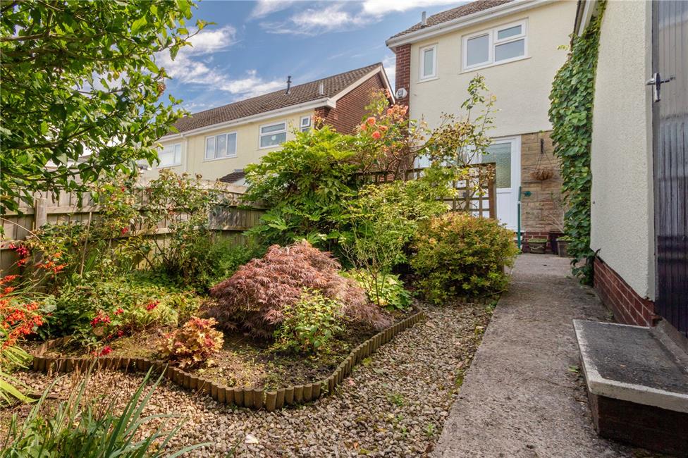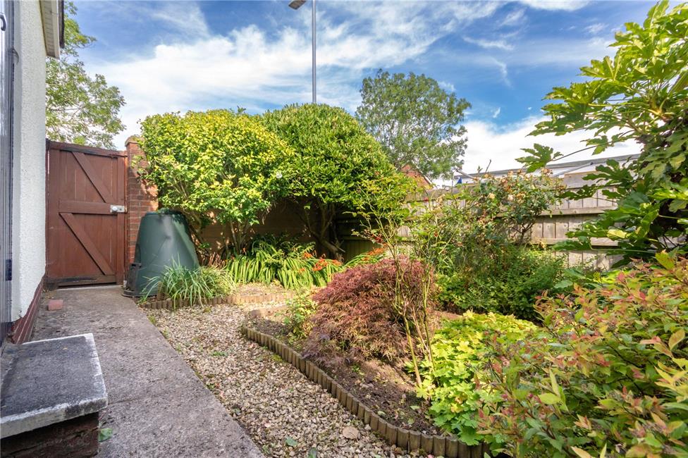 Keyblock paved patio area with path leading down onto a rear section laid with lose stone chippings, well stocked flower beds, timber gate to rear further timber gate to the side leading to the front garden, side door to garage.