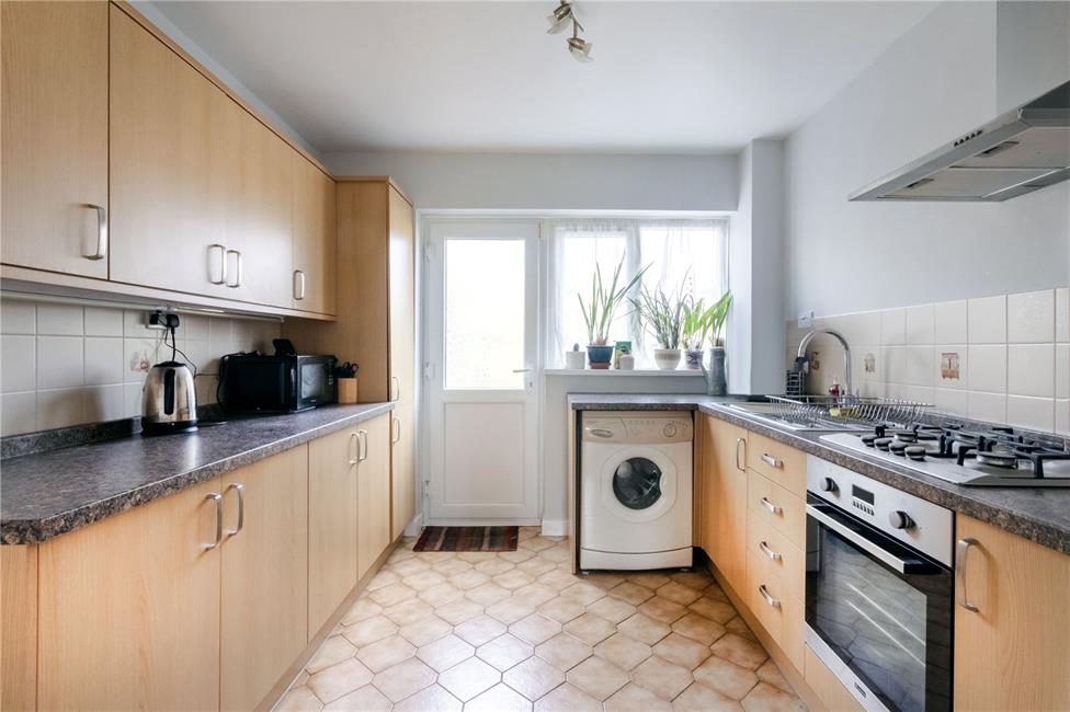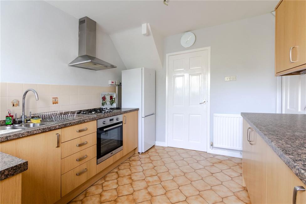 Appointed along three sides in light wood grain finish fronts beneath round nose worktops surfaces, inset one and a half bowl stainless steel sink and drainer with swan neck mixer tap, four ring gas hob with oven below and stainless steel cooker hood, space for upright fridge/freezer, space and plumbing for automatic washing machine, matching range of eye level units, ceramic floor tiling to worktops surrounds, tiled flooring, radiator, window and UPVC glazed door to the rear garden.