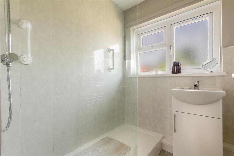 White suite comprising shaped wash hand basin with mixer tap and storage cabinet below, large shower tray with glazed shower screen and rainfall style thermostatic shower, chrome heated towel rail, tiled effect panelling to wet areas, vinyl floor covering.