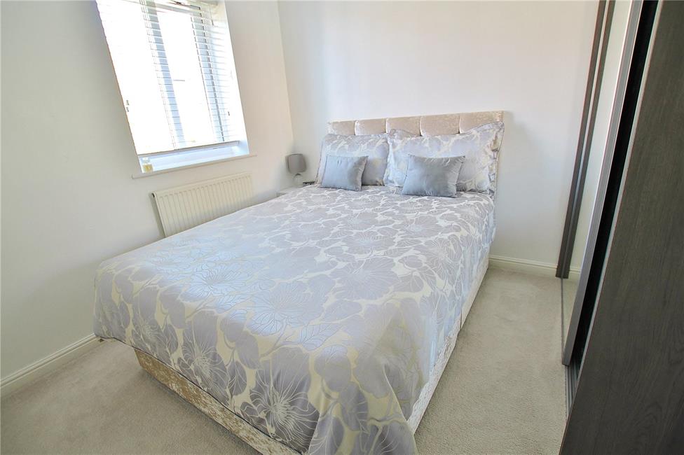 Aspect to front, a second double bedroom, coved ceilings, radiator, built in wardrobe with hanging rail and shelving.