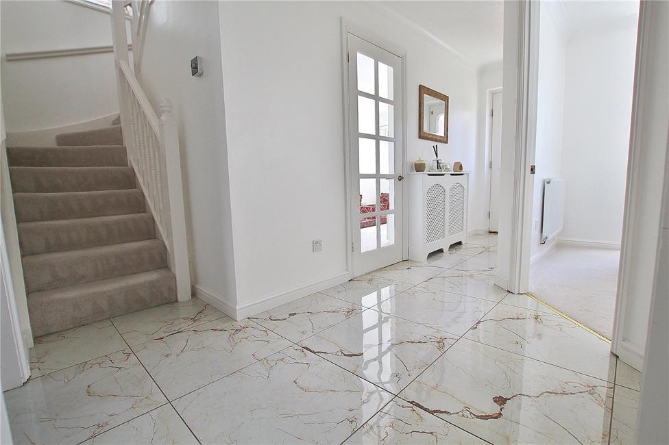 Approached via a sheltered porch, entrance door with glazed inserts to upper part, leading onto a welcoming central hallway with full turning spindle staircase to first floor landing, radiator, quality marble effect floor tiles.