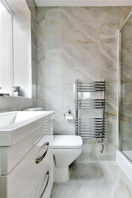 White suite comprising low level WC with push button cistern, vanity wash hand basin with cabinet below, continuation of the quality marble effect tiled flooring, radiator.