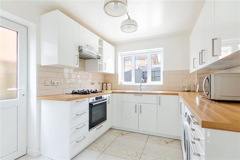 Appointed along three sides in white gloss finish fronts beneath oak finish worktop surfaces, inset 1.5 bowl stainless steel sink with drainer and swan neck mixer tap, four ring gas hob with Bosch oven below and cooker hood above, space and plumbing for automatic washing machine, space for upright fridge freezer, matching range of eye level units, stylish ceramic wall tiling to worktop surrounds, quality marble effect floor tiling, window to rear, coved ceilings, uPVC glazed door to side.