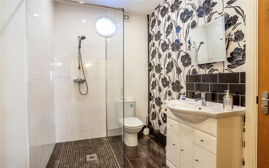 Stylish suite comprising low level WC, shaped vanity wash hand basin cupboards below, large walk - in shower cubicle with glazed shower screen, tiled flooring, towel rail. Connecting door to study. Under floor heating.