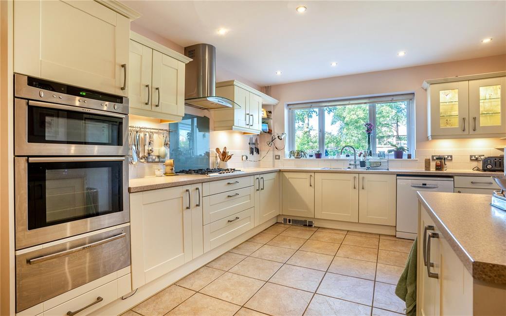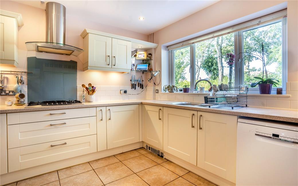 Fitted along four sides in light cream fronts beneath round nose worktop surfaces, inset Neff five ring gas hob with cooker hood above, matching range of base and eye level wall cupboards with pelmets and boarders, concealed lighting, integrated Neff oven with separate grill, warming tray(not functioning), inset one and half bowl Franke sink and drainer with mixer tap and immediate hot water, plumbing for dish washer, ceramic wall tiling to worktop areas, pleasing aspect to the rear garden, ample space for breakfasting, tiled flooring, ceiling spotlights, large walk-in pantry with shelving.