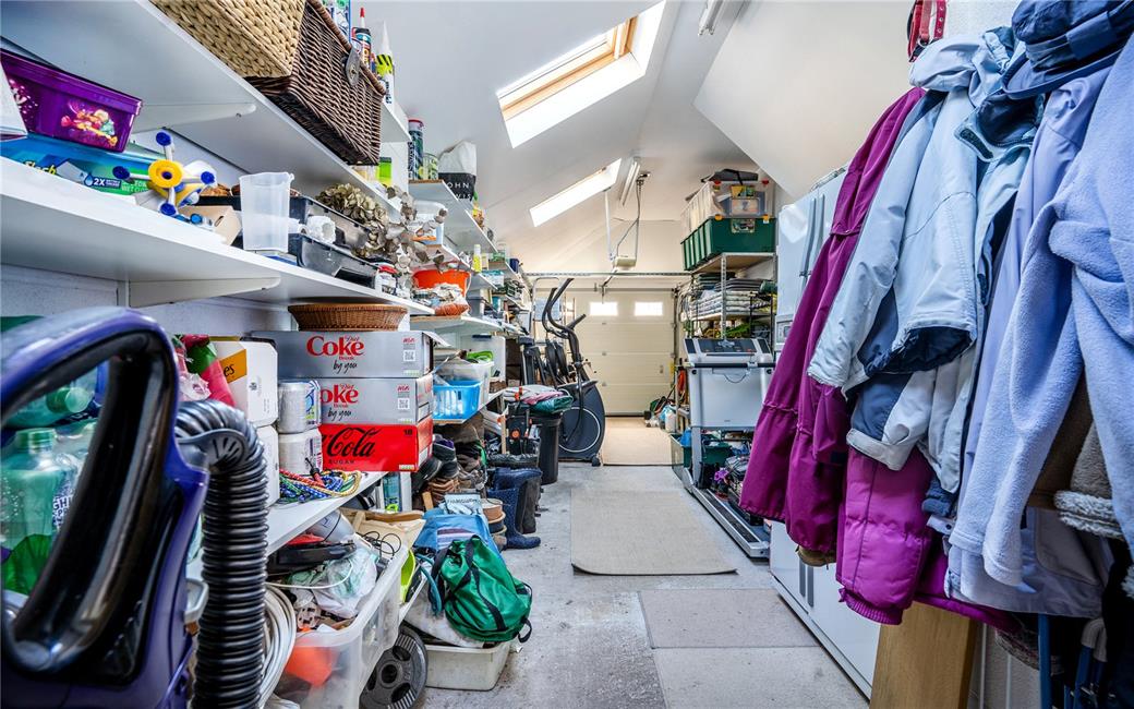 With electric up-and-over door, connecting door to the main residence, power and lighting, wall mounted Valliant gas central heating boiler. Ample shelving, radiator.