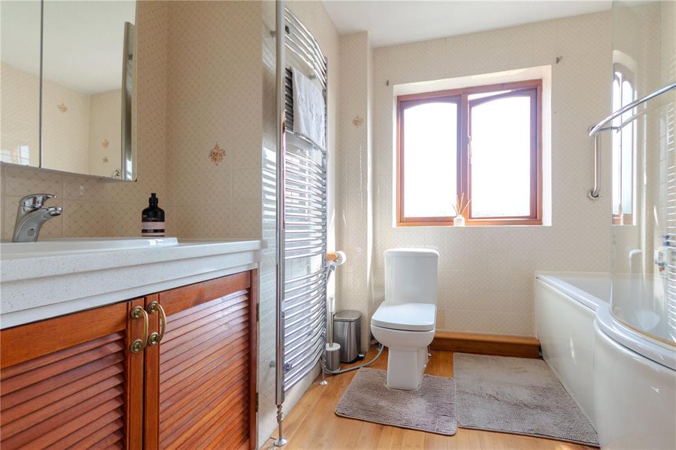 Stylish white suite comprising low level WC, wash hand basin with cupboard below, P-shaped bath with Aqualisa shower with shower head and semi-circular screen door, chrome heated towel rail, ceramic wall tiling, quality flooring.