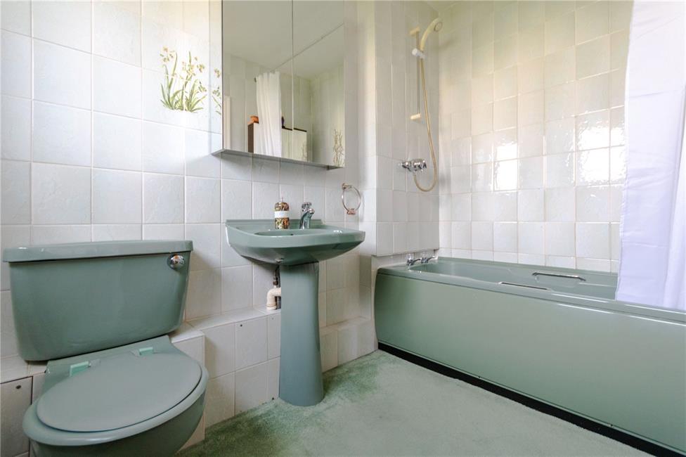 Comprising low level WC pedestal wash hand basin, panelled bath with hand grips, Mira shower, ceramic wall tiling, and chrome heated towel rail.