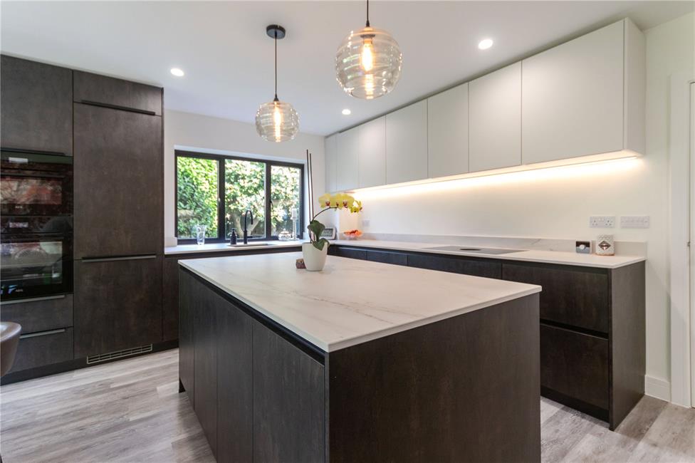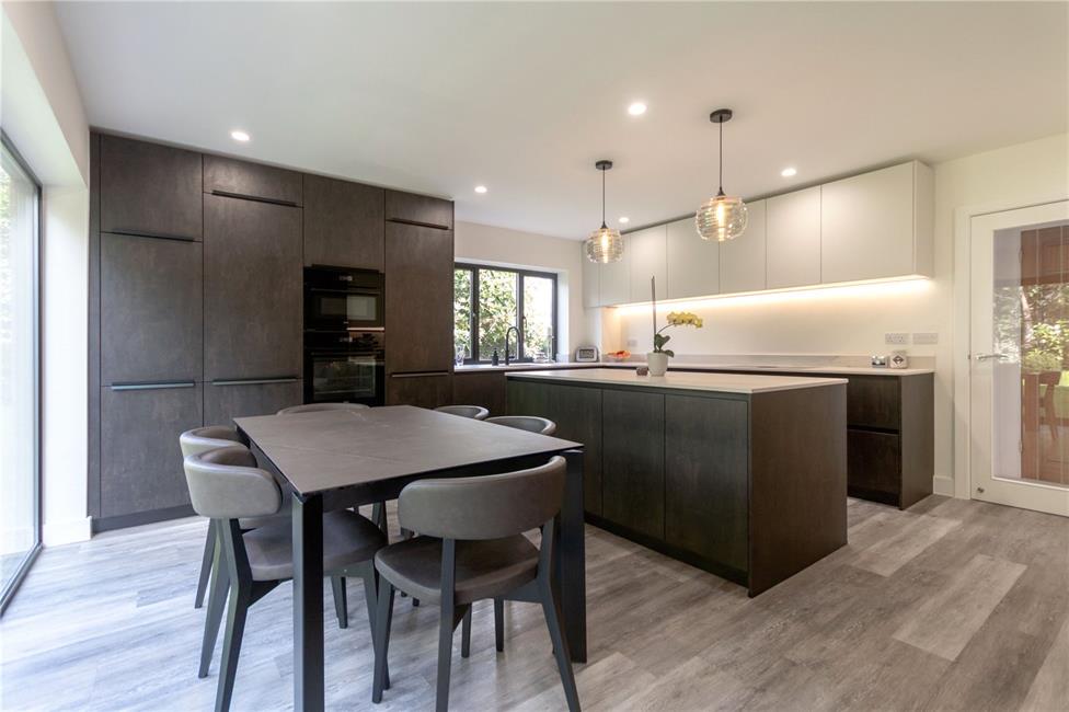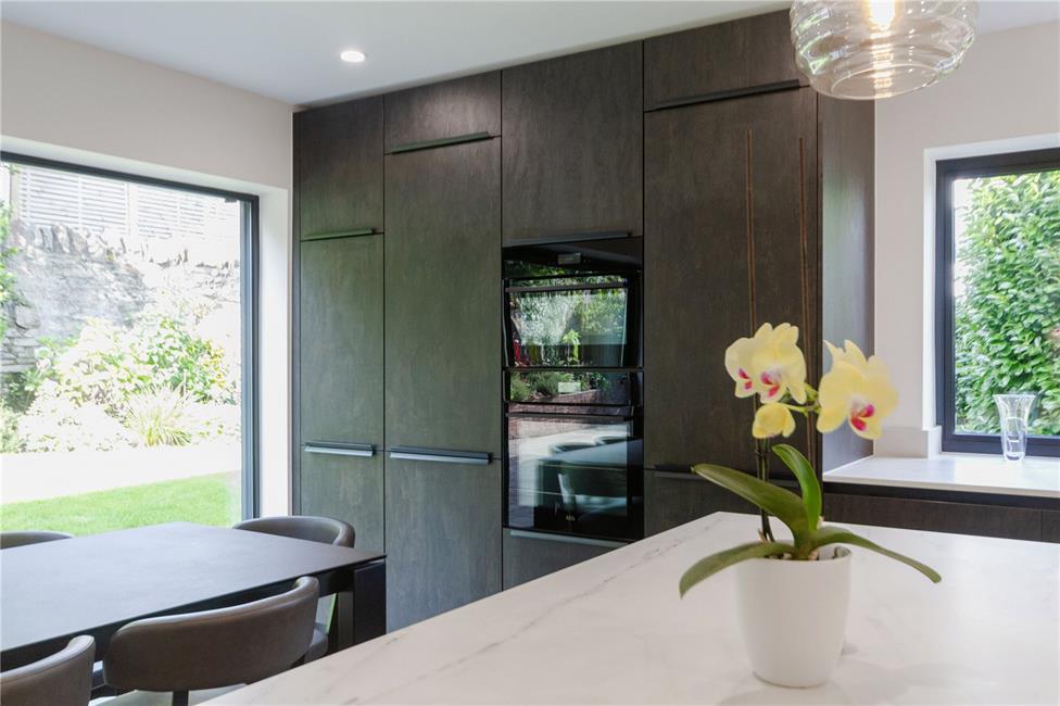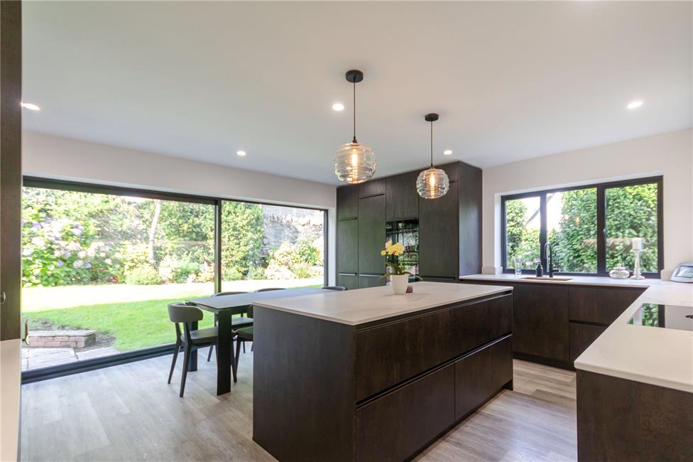 Luxury appointed German fitted kitchen by Artisan Kitchen interiors, along two sides beneath stylish Dekton high quality worktop surfaces, inset Blanco sink with Quooker PRO3 flex boiling hot and cold water tap, matching Dekton splashbacks, matching range of eye level wall cupboards, integrated AEG microwave/oven, integrated AEG steam oven, integrated fridge with matching front, integrated freezer with matching front, aspect to side, integrated dish washer with matching front, integrated Bora induction hob, feature central island with base cupboards, wall vertical radiator, quality flooring, ample space for breakfast table, double glazed patio door with matching floor to ceiling side screen overlooking the delightful rear garden, ceiling spot lighting.