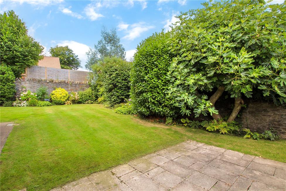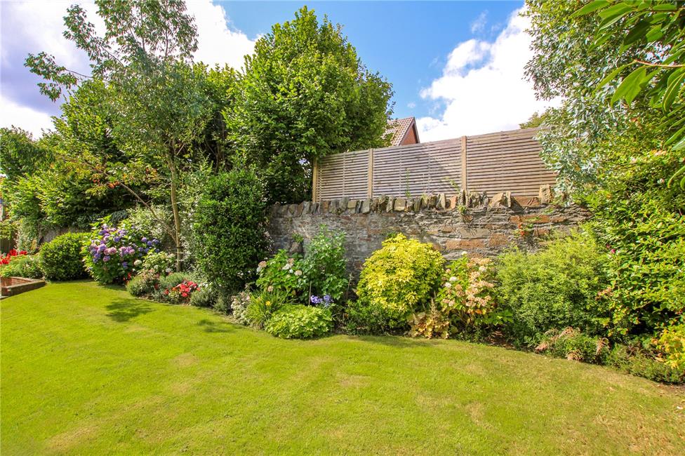 Wide paved patio relaxation area, raised brick walling, shaped borders, shrubs and plants continuing onto the side lawn having an additional patio/relaxation area. Apple and pear fruit trees to side. Stone walling to rear and side, enjoying privacy and a sunny aspect.