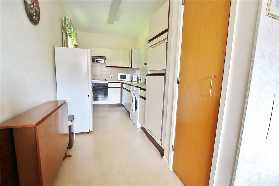 Overlooking the beautifully manicured enclosed side garden, fitted kitchen appointed along two sides comprising of eye level units and base units with drawers and round nosed worktops over, ceramic wall tiling to work surface surrounds, four burner electric hob with oven below and cooker hood above, inset sink with drainer, plumbing and space for washing machine, integrated fridge and freezer, space for a small kitchen breakfast table and chairs, further cupboard housing the hot water cylinder.