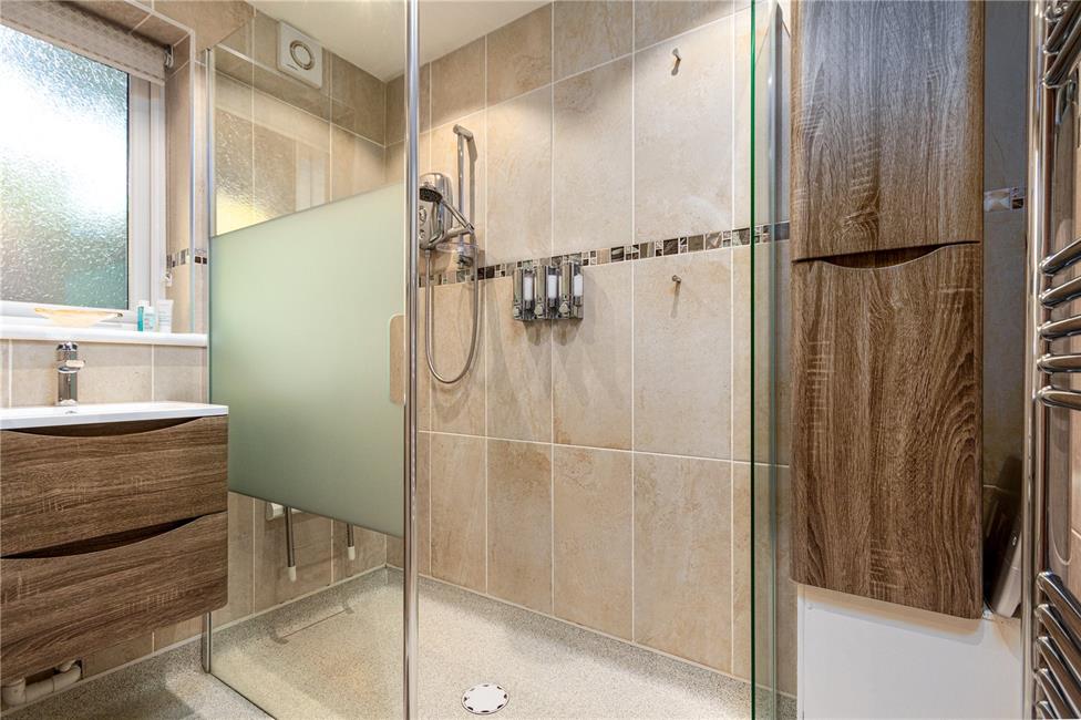 Completely refurbished in 2021, opaque window to the rear, a beautifully appointed wet room, walk-in shower with electric shower over, a fixed glazed shower screen and sunken drain, ceramic wall tiling with decorative border, anti-slip flooring, wall mounted wash hand basin with storage beneath, comprehensive ceramic wall tiling, heated chrome towel rail, built-in storage cupboard, fixed vanity mirror with touchless light, ceiling spotlight, eye level heater.