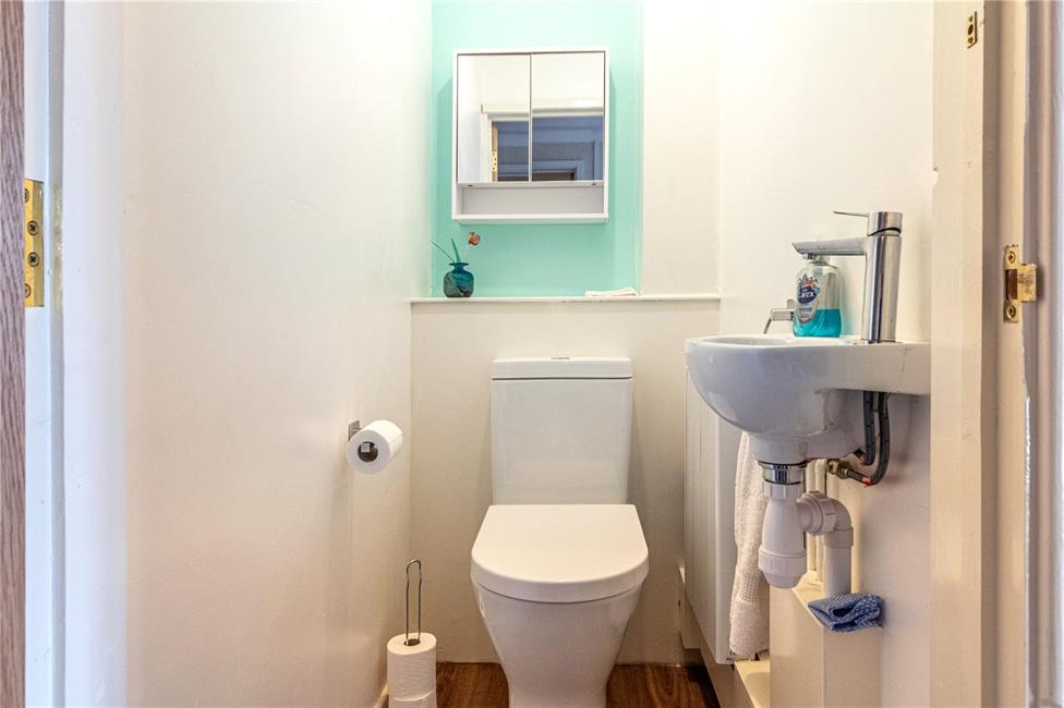An updated room with close coupled push button WC, wall mounted wash hand basin, electric radiator, oak effect vinyl flooring.