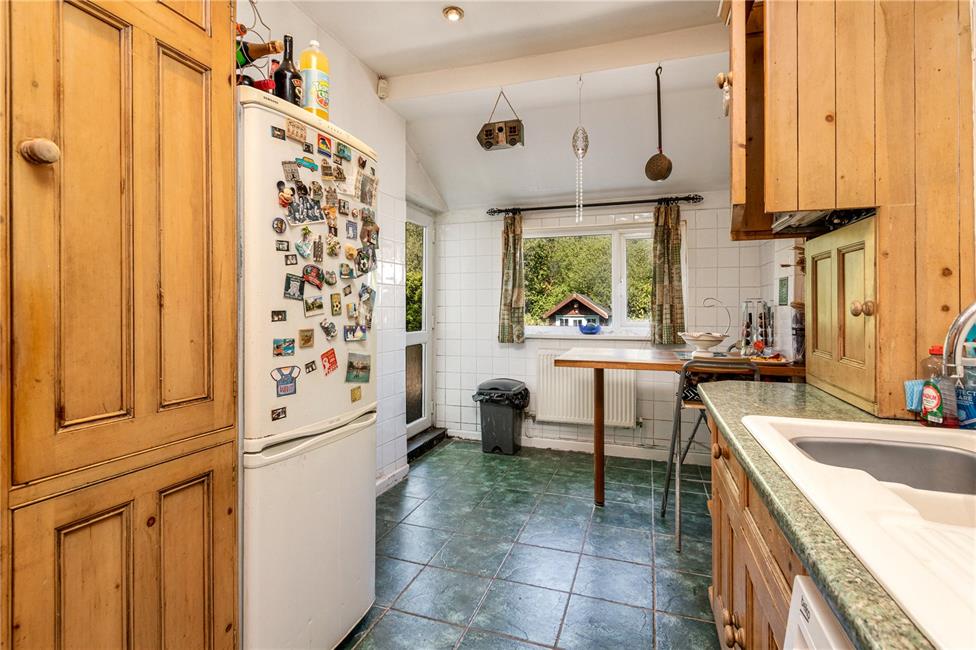 With a range of bespoke country pine fitted units beneath round nosed worktop surfaces, inset 1.5 bowl porcelain sink and drainer with mixer tap, inset four ring gas hob with circulating fan above, matching range of base and eye level wall cupboards with pelmets and borders, Indesit integrated oven, plumbed for automatic washing machine, concealed wall mounted Worcester gas central heating boiler, ceramic wall tiling, bespoke breakfasting table in hardwood, overlooking the attractive rear garden, double glazed door to side, panelled radiator.
