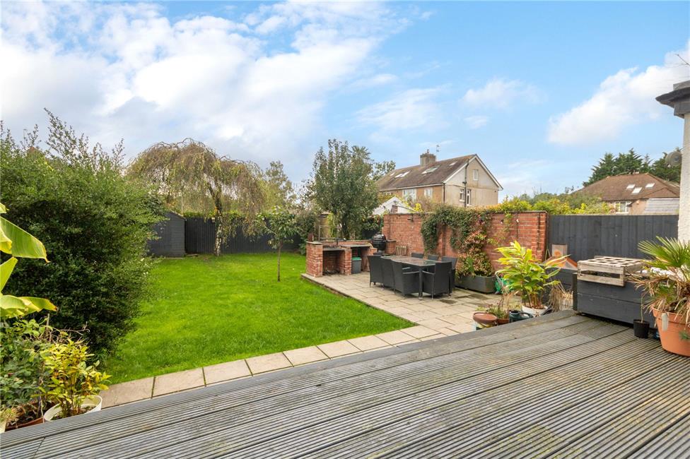 60ft south facing enclosed rear garden, initial decking area with steps leading to a central well maintained lawn with large patio relaxation area and purpose brick built BBQ area, garden shed, outside lighting, two outside water taps, power point.