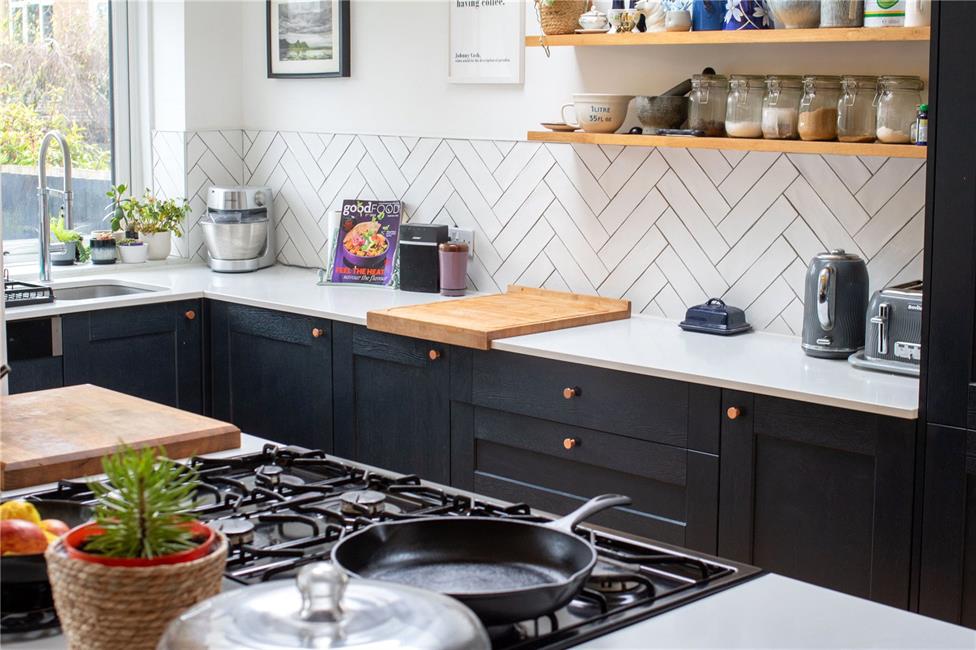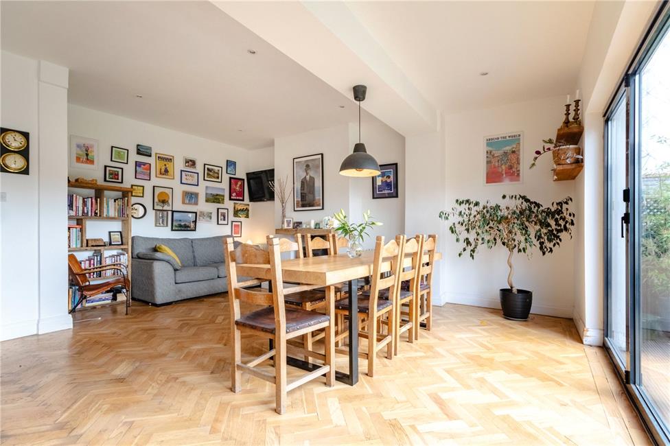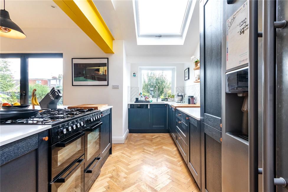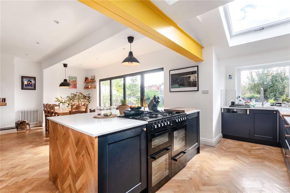 A superb example of open plan living, extending beyond the width of the property offering a kitchen, breakfast, dining, living space with bi-folding doors opening onto the rear decking and South facing garden beyond a feature exposed painted RSJ, further double glazed sky lights, a quality deep blue wood finish kitchen appointed along two sides with a large central island comprising of eye level units and base units with deep pan drawers and quality white quartz worktops over with ceramic wall tile surrounds and additional shelving, inset sink with flexible hose, further window to the rear garden, quality heringbone style woodblock flooring, large breakfast bar with a range style cooker with a seven burner gas hob and multiple ovens below, integrated Neff dishwasher, space for an American style fridge freezer, ceiling spotlights, two stylish radiators, door to the utility room. A further large dining and family area.