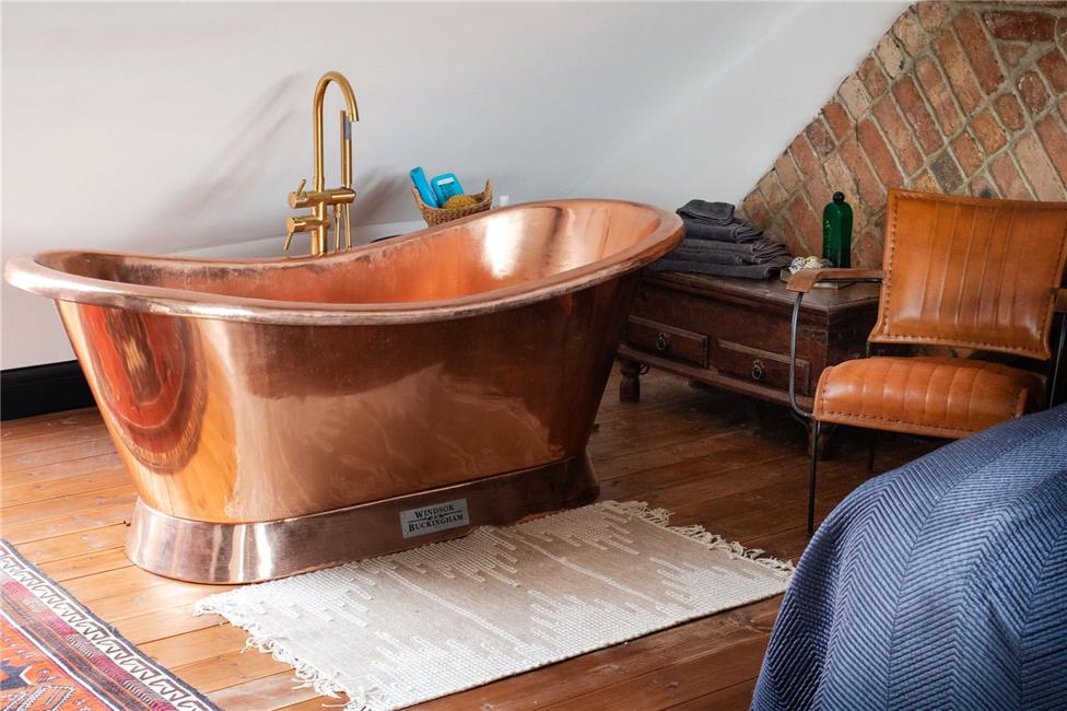 A feature Velux window folding out to a balcony overlooking the front, aluminium framed double glazed tri folding doors with feature glazed Juliet balcony overlooking the rear garden, exposed floorboards, ceiling spotlights, radiator, a feature floor standing brass bathtub (Windsor and Buckingham) with floor mounted taps and shower hose, door to ..