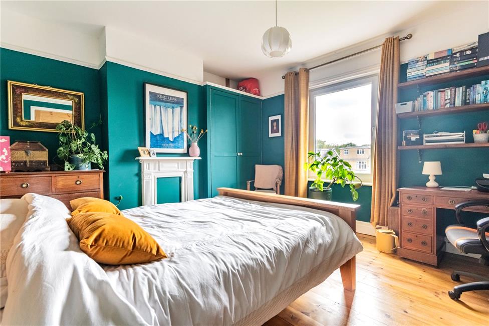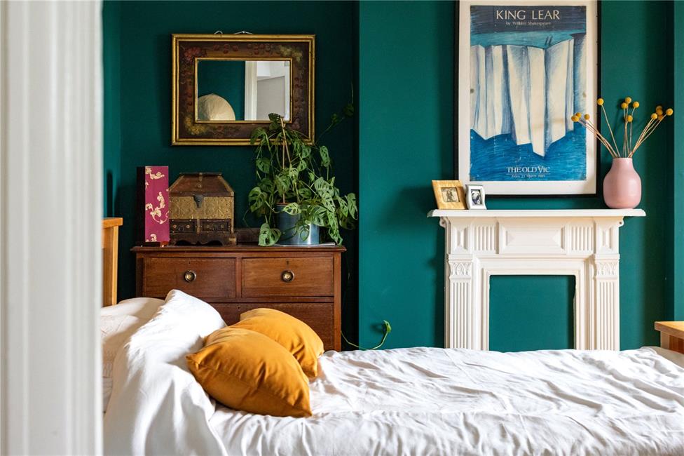 A feature bay window to the front, exposed and painted floorboards, fireplace with original tiled hearth, fitted wardrobes comprising of two doubles, period coved ceiling, picture rail and skirting boards, stylish period radiator.