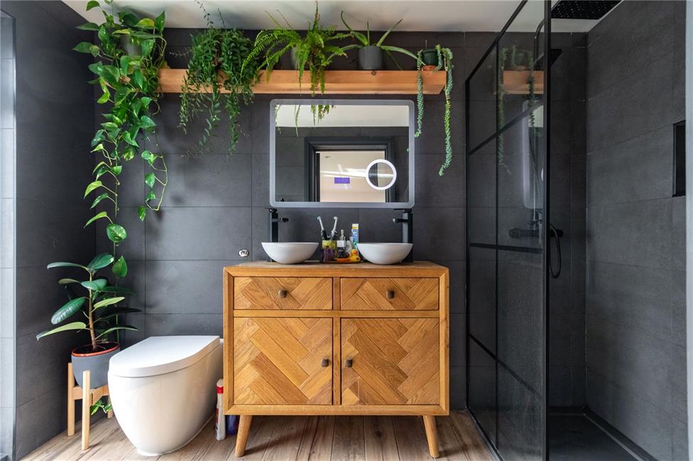 Full height opaque window to the rear, a superb suite with a walk-in shower area with fixed rainfall style showerhead and flexible shower head with thermostatic controls, recess shelf, fixed glazed shower screen, stylish storage unit with twin wash hand basins and mixer taps with digital blue tooth mirror above, a low level WC with concealed cistern and push button flush, wood effect ceramic floor tiling with underfloor heating, grey wall tiling, heated towel rail, ceiling spotlights.