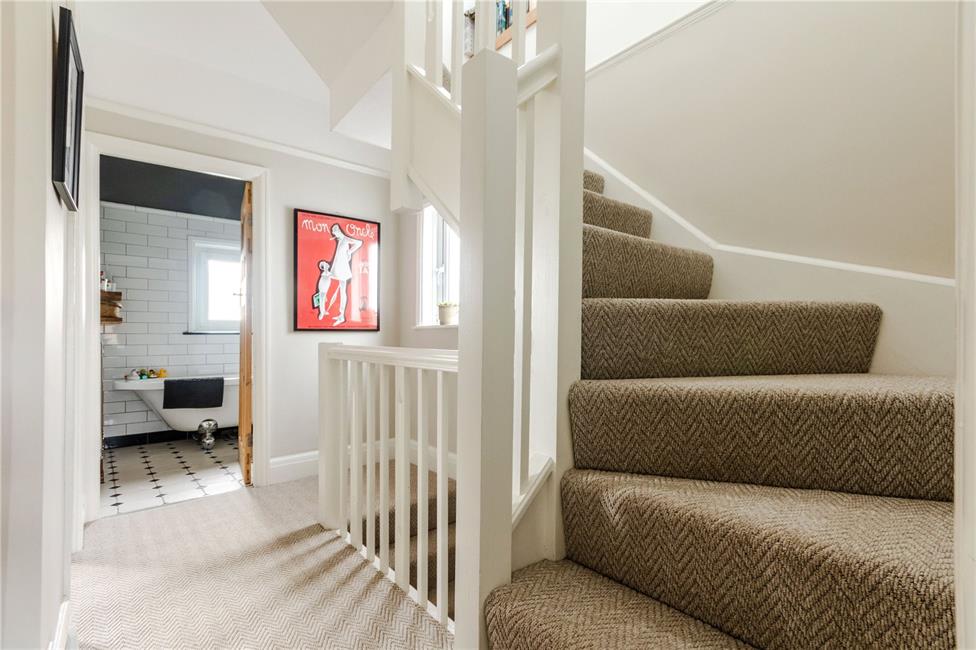 Opaque window to the side, spindle balustrade, full turning spindle staircase to the second floor landing, period picture rail, skirting boards and door architrave surround.