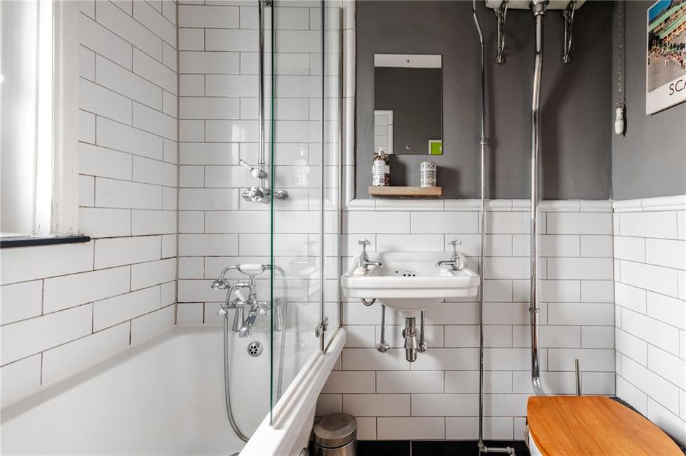 Continuation of the period tiled floor, wall mounted WC with concealed cistern and push button flush, corner wash hand basin, stylish wall tiling