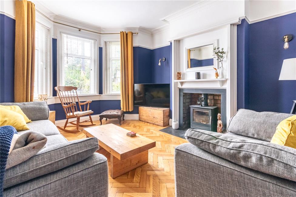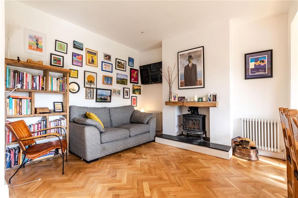 uPVC double glazed bay window overlooking the enclosed driveway, a feature fireplace with above mantel mirror, inset log burner with exposed brickwork on a slate hearth, many period features include the coved ceiling, picture rail, high level skirting boards and herringbone style wood block flooring, broadband master socket.
